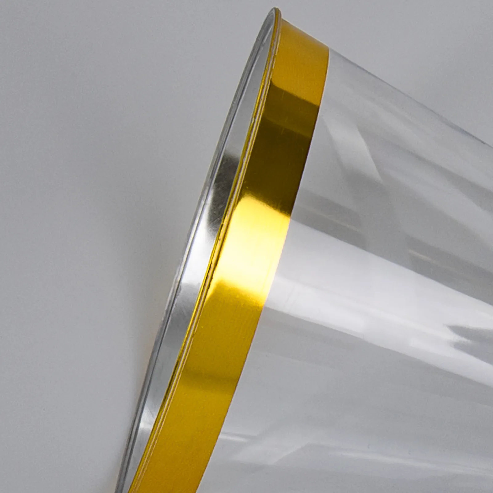 This clear plastic cup is crystal clear and features an elegant gold edge design.