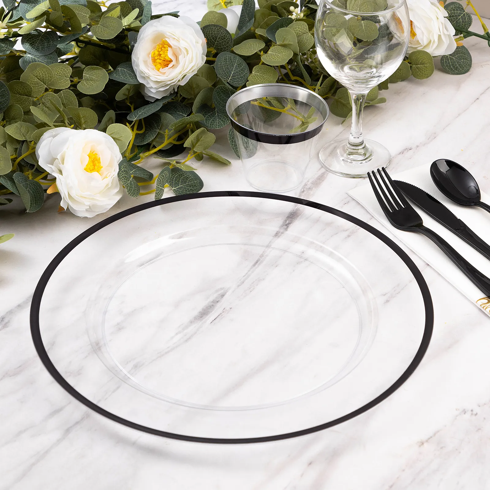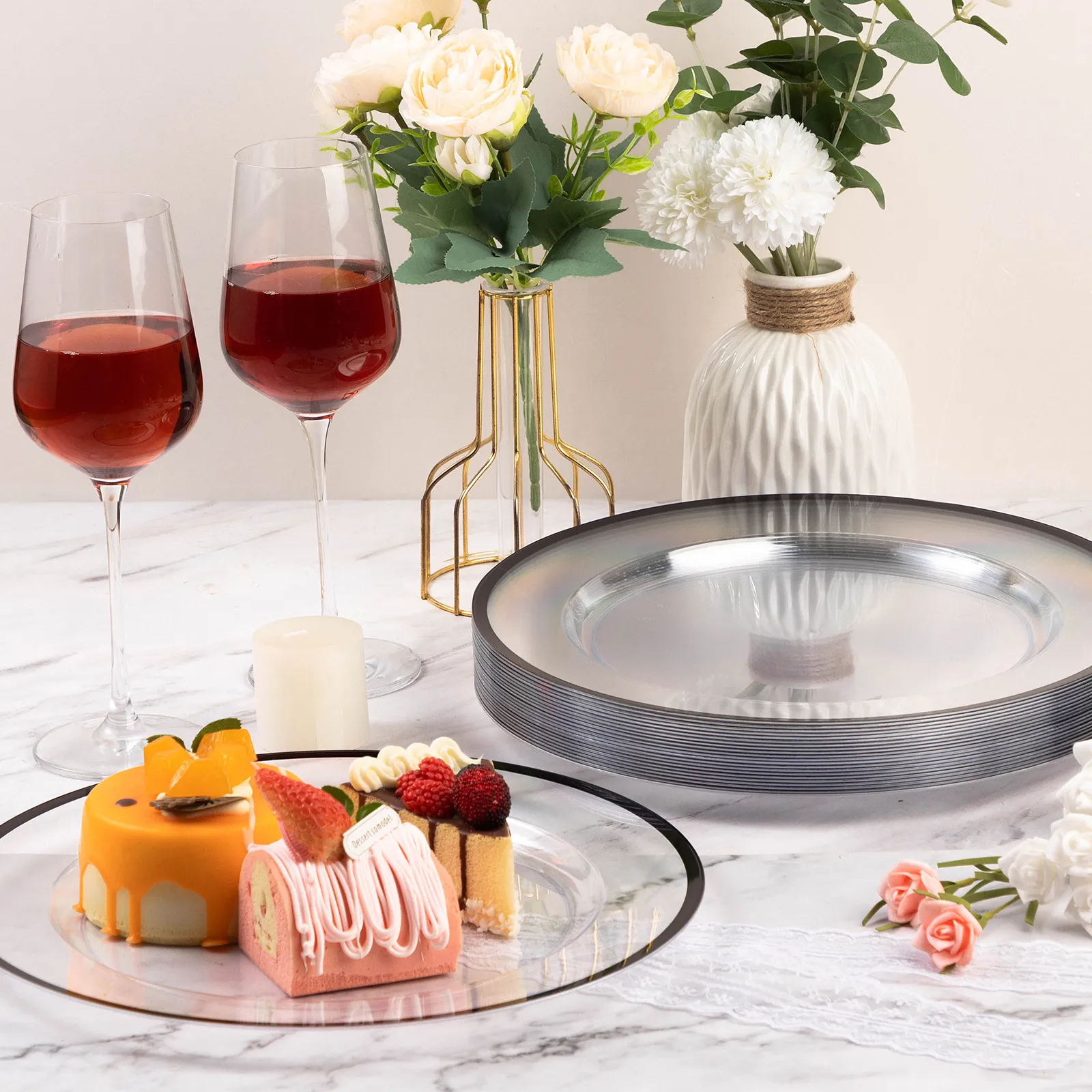 A black rimmed charger plate is a black-rimmed dinner plate with a transparent base color. It can be used to hold food or as a decorative base plate under the dinner plate. Its materials are mainly PS, PP, etc. It has a transparent texture, calm and heavy, and is suitable for private customized dinners, wedding banquets, and other activities.
