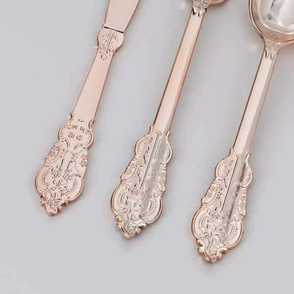 This rose gold cutlery features a retro design, similar to real metal tableware. It has elaborately carved handles, a smooth surface, and is sturdy and durable.